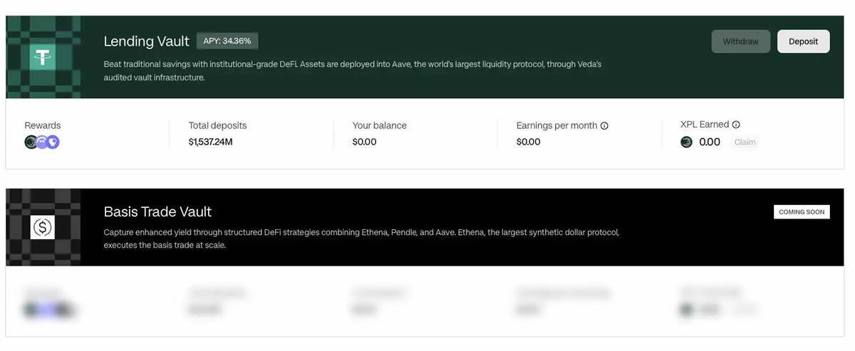 这个活动是 Plasma 官方发起的,在 Veda 协议下的 PlasmaUSD Vault 以持币挖矿的形式发放 WXPL,当前只开放了 Lending Vault,未来也会开放 Basis Trade Vault。