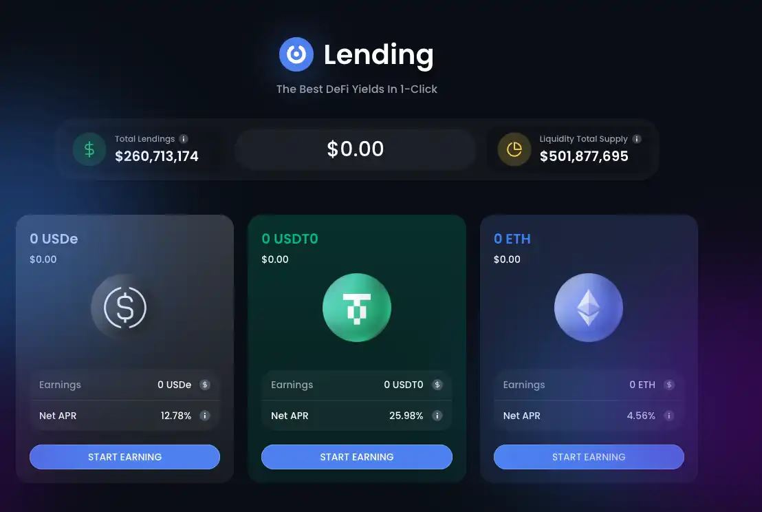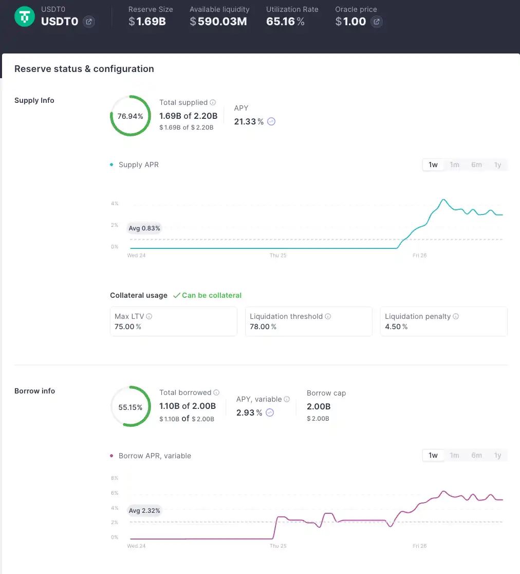 再用 USDT0 去借贷池提供流动性,当前年化收益率约为 25%。