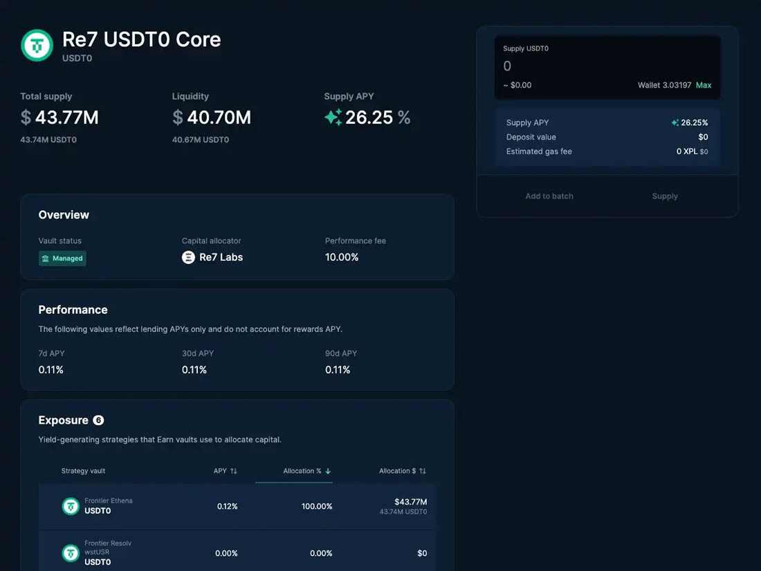 同样在 Euler 协议下,Re7 Core USDT0 Vault 则采用无损活期的借贷模式,用户将 USDT0 存入该 Vault 即可参与。该池当前年化收益率约为 30.43%,每日奖励约为 3.5 万美元等值的 XPL,Euler 的池子虽然 TVL 相对较低,但收益率和奖励水平同样可观,适合散户分散配置。