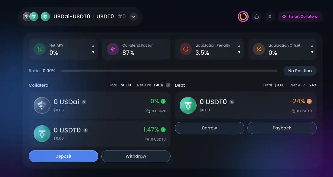 Fluid 协议的 fUSDT0 Vault 提供用户存入 USDT0 、USDe、ETH 到借贷 Vault 的奖励,以及以 USDai 和 USDTO 为凭证借贷 USDT0 的奖励,意味着可以首先抵押 USDai 和 USDT0 借出 USDT0 获得约 24% 的年化收益率。