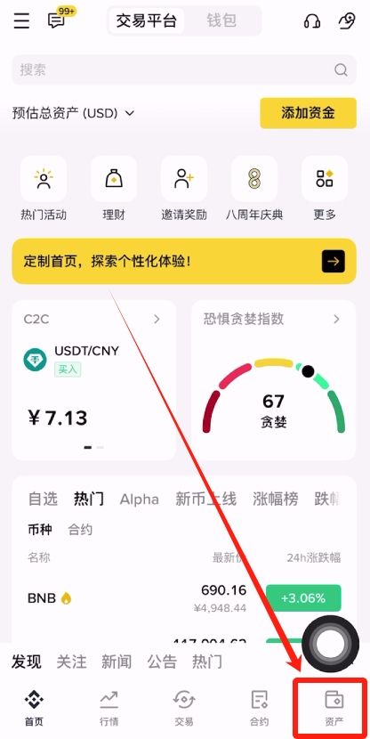 我们买好的USDT都会在资金账户里面,点击右下角的【资产】。