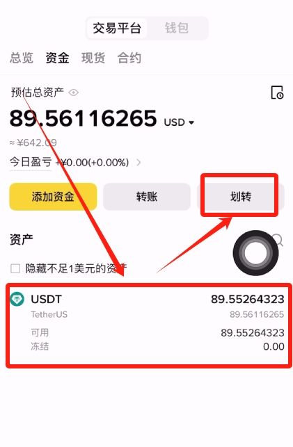 在资金账户里面就可以看到我们购买好的USDT了,然后点击这里的【划转】。