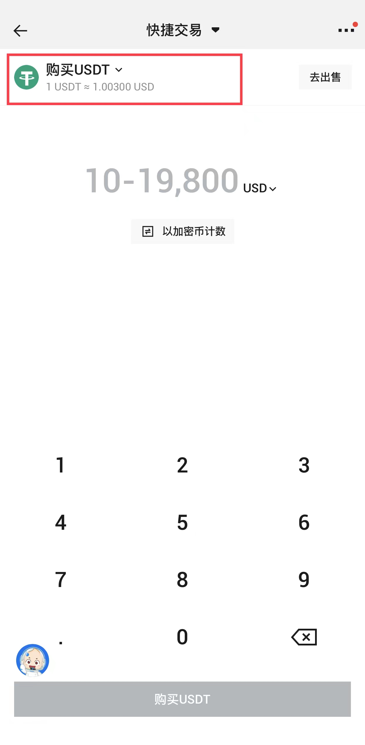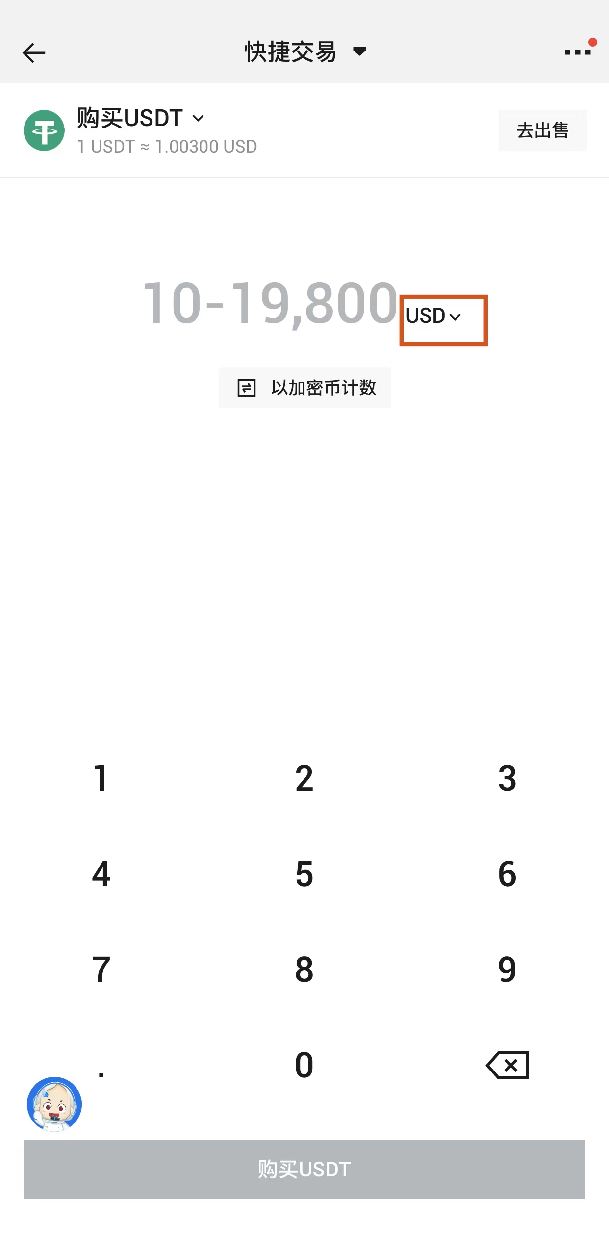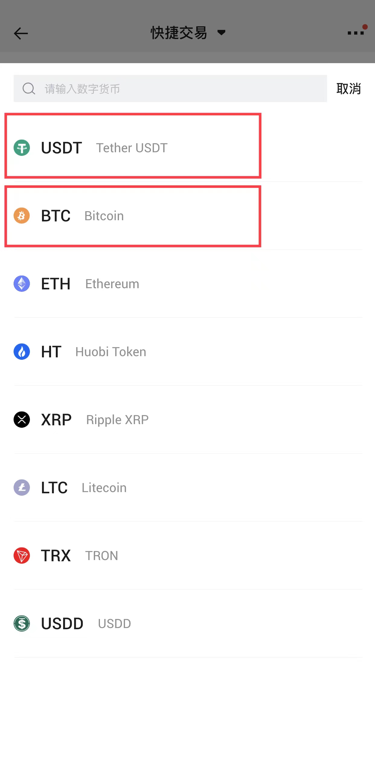 点击上方选择BTC或USDT(稳定币),此处以USDT为例。