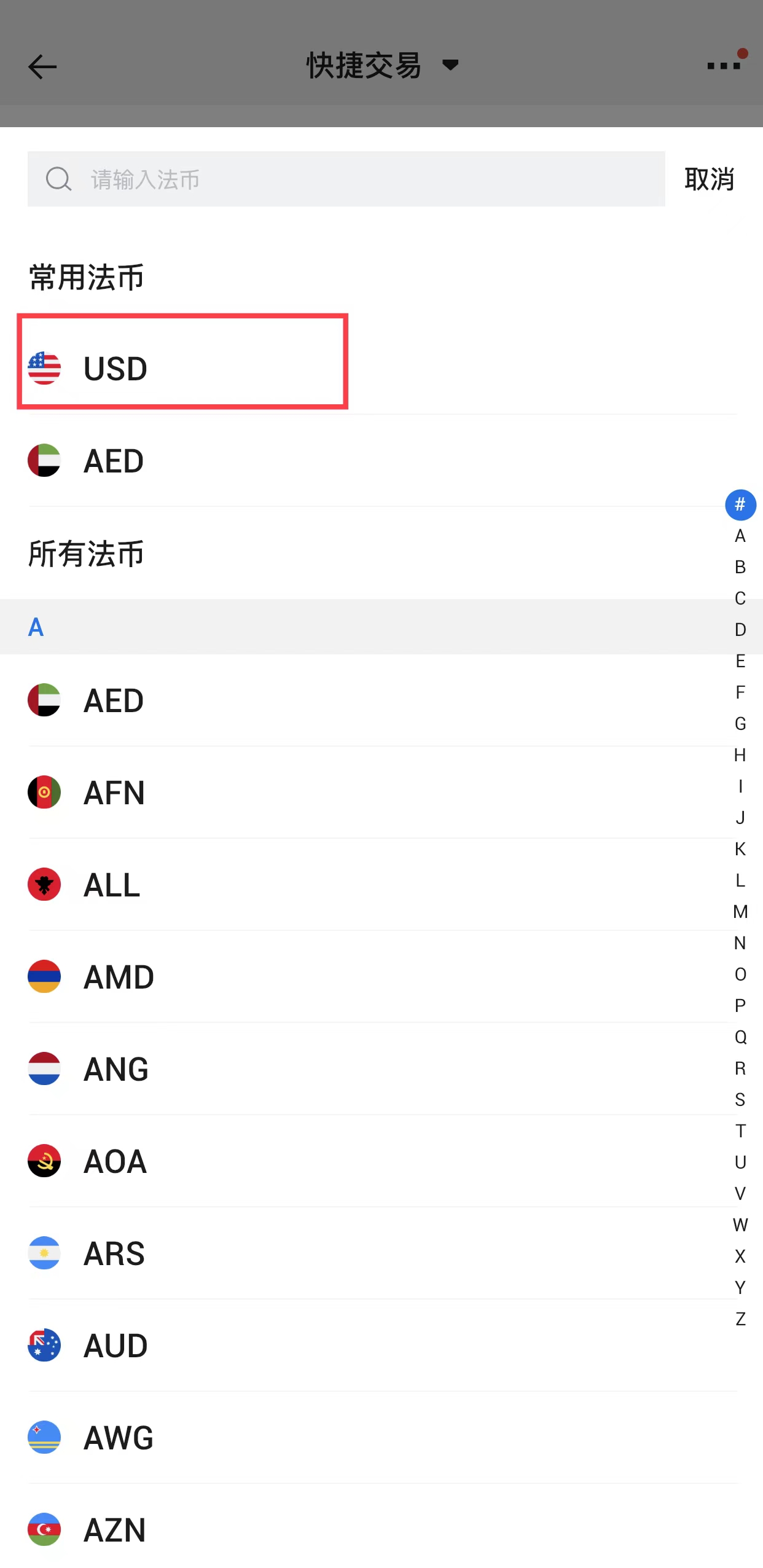 选择支付的法币,如美元
