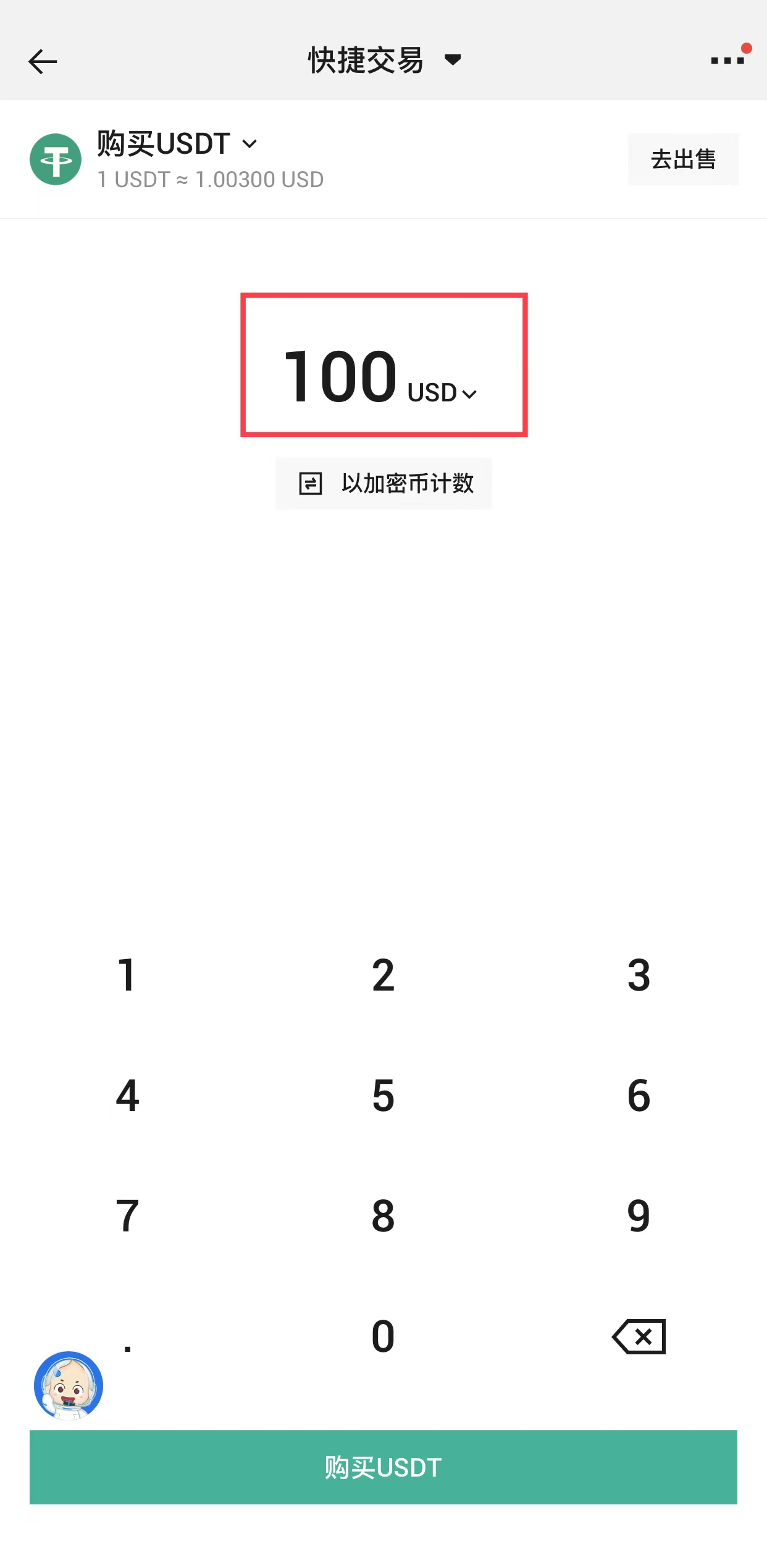 输入购买的数量,如100USD,随后点击【购买USDT】