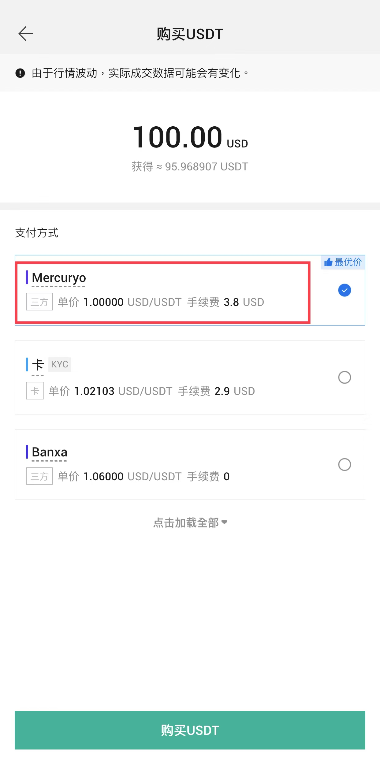 选择您喜欢的支付方,如Mercuryo,随后点击【购买USDT】