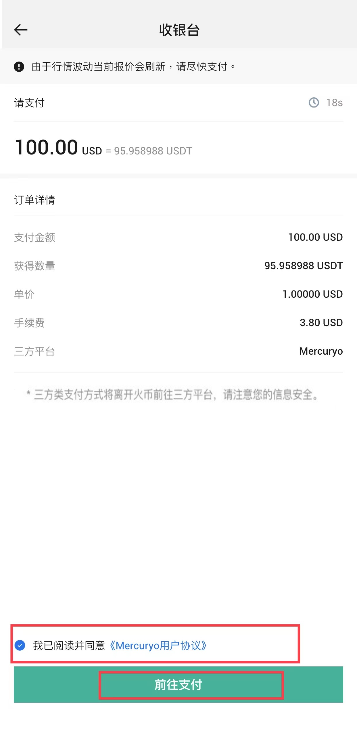 前往第三方完成支付后,即完成了USDT购买