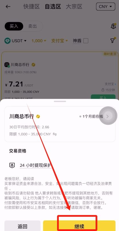 币安平台就会为我们筛选出商家了,我们要找成单量和成交率高的商家来进行购买。比如说“川商总币行”这一家,点击【买入】。