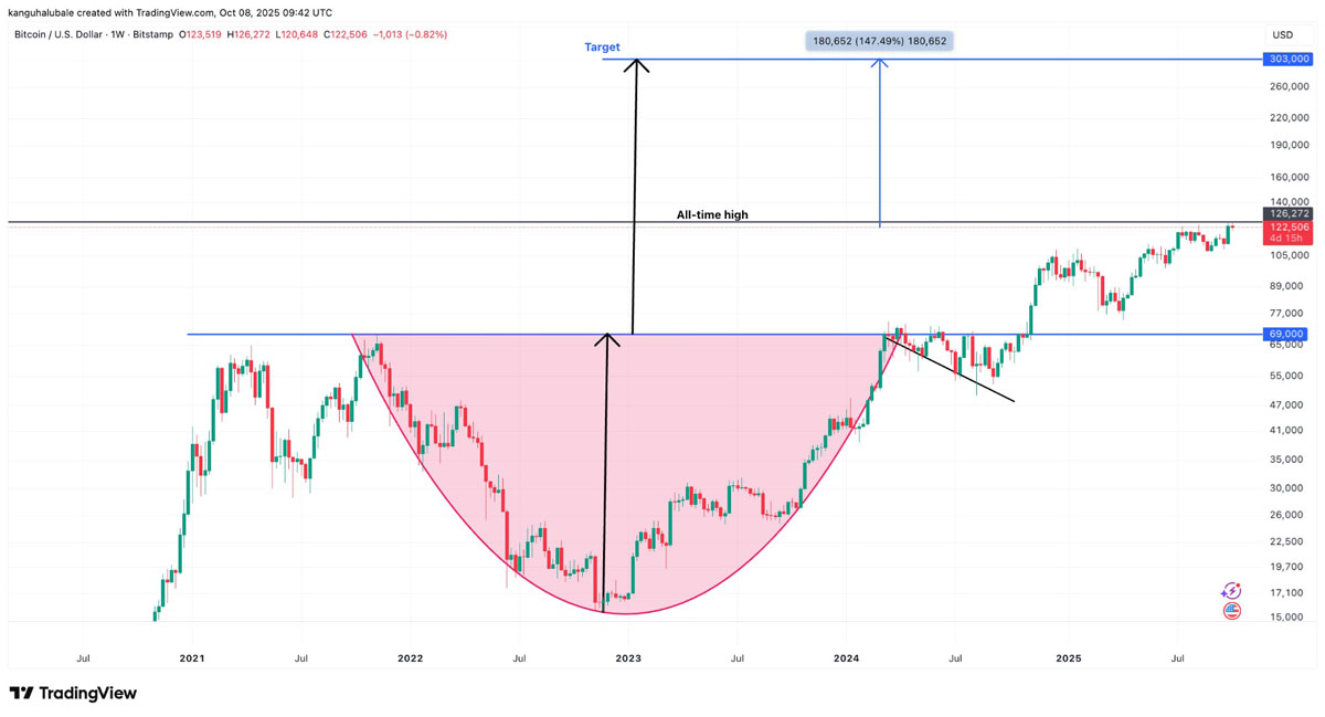 根据图表分析师Gert van Lagen的预测,这一突破的目标为2025年至2026年间约30.3万美元。