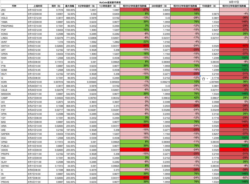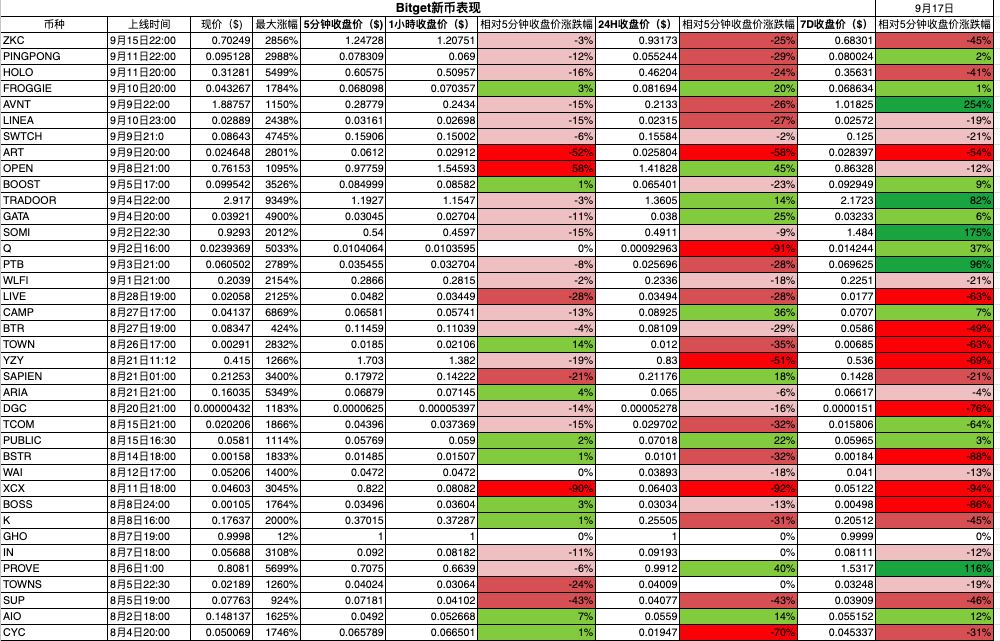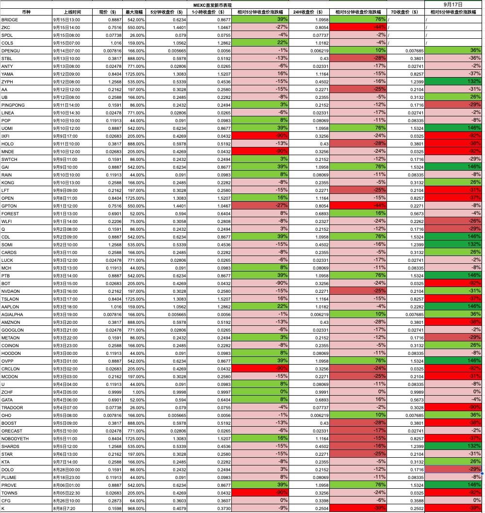 除了上币数量,新币上市后的价格表现是评估各交易所“上币效应”的核心指标。我们将各平台新币在不同时间周期(5分钟、1小时、24小时、7日)的价格涨跌幅进行横向对比,观察哪些交易所的新币涨幅集中、哪家平台破发(上市后下跌)比例较高。