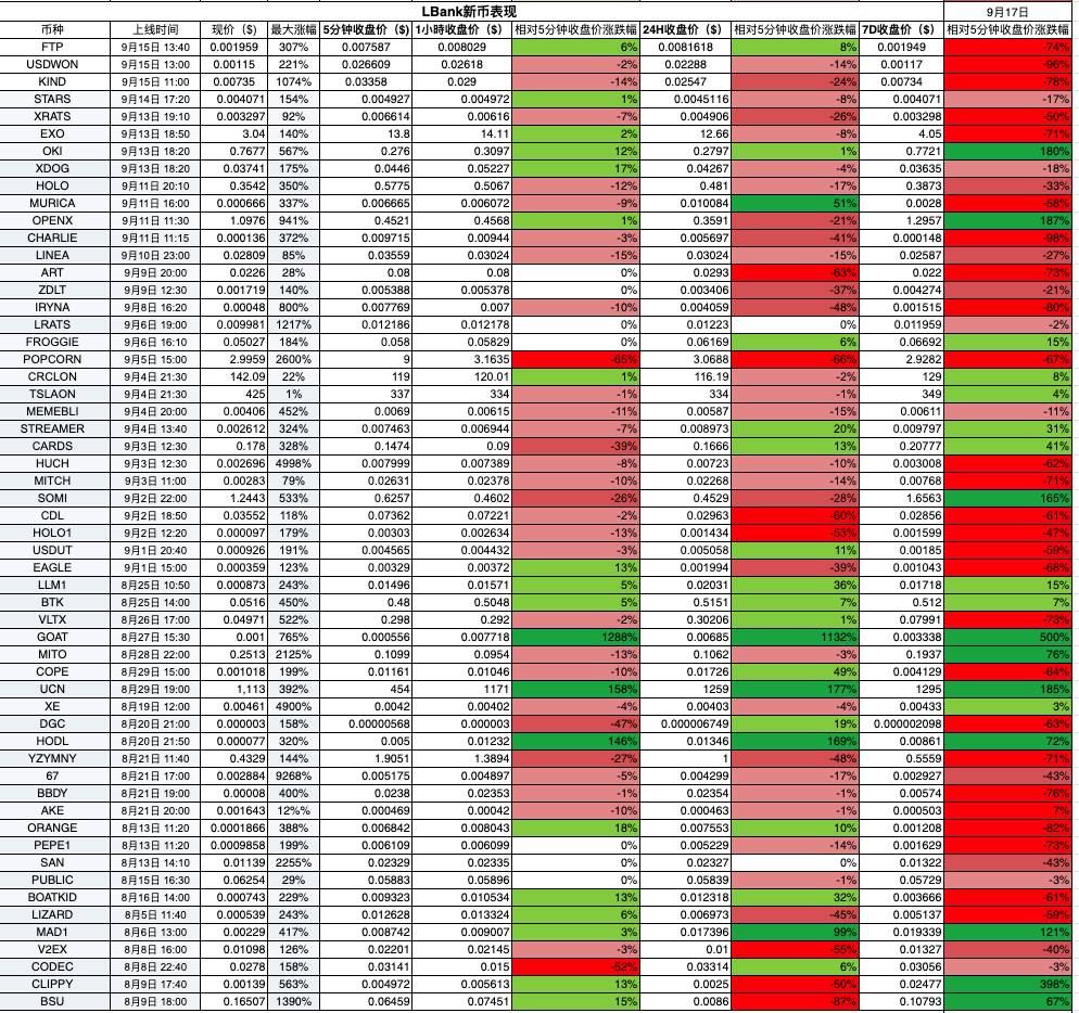 数量最多,上币如“机关枪”般高频。据不完全统计,LBank在该期间上线了数十枚甚至上百枚新币,延续了上半年“日均2-3个新币”的猛烈节奏。这种高密度上新为市场提供了众多试错机会,但项目质量良莠不齐,七日内价格剧烈分化的现象突出(此前5-6月样本中有九成项目一周内出现大幅涨跌分化)。