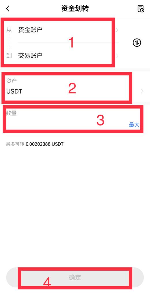 注意划转的方向为由“资金账户”划转到“交易账户”,选择币种为:USDT,数量点击“全部”,点击【确定】按钮。