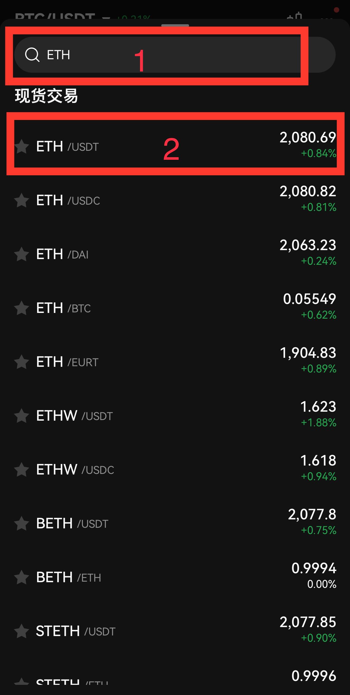 搜索框内输入“ETH”,选择“ETH/USDT”。