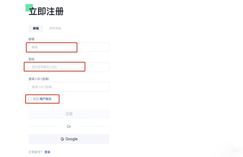 2、在注册页面,根据提示填写信息(邮箱、登录密码等),勾选“接受用户协议”,点击“注册”。