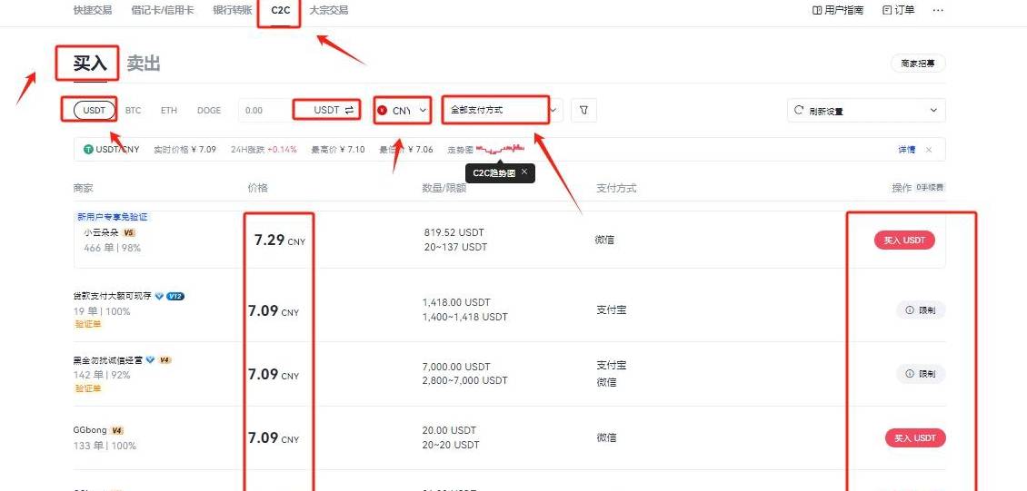 4、认证结束后,点击首页页面上方导航栏的“买币”——“法币交易”,购买货币之前通常需要购买一定数量的USDT,以便交易。选择C2C,选择买币,选择USD,根据自己的需求选择合适的商家。