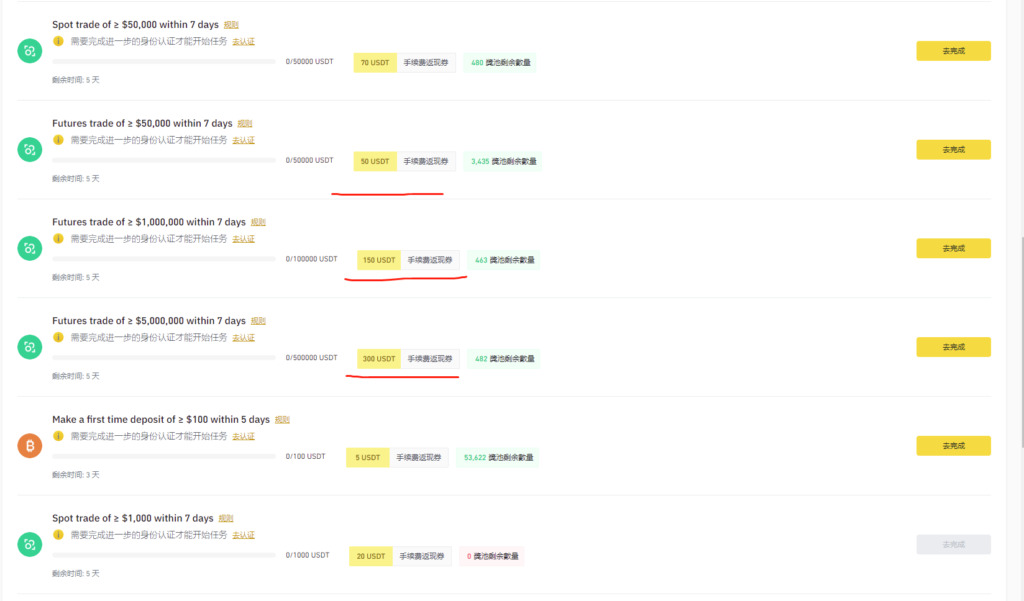 - 在任务中心页面中,会列出多项任务,包括充值、现货交易和合约交易等。根据完成任务的数量和规定时间内的交易量,可以获得不同数额的返现券。