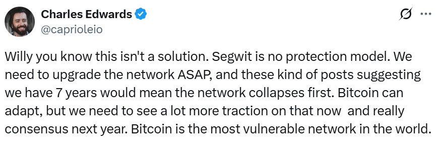 然而,量化比特币和数字资产基金Capriole创始人Charles Edwards此前曾警告过量子计算机对比特币的威胁,他认为这个解决方案”并不抗量子”。