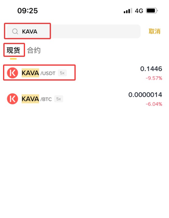3、输入【KAVA】,这时下拉会显示【现货】【KAVA/ USDT】,点击【KAVA/ USDT】。(作为新手,不建议做合约,所以这里就不演示合约购买方式了。)