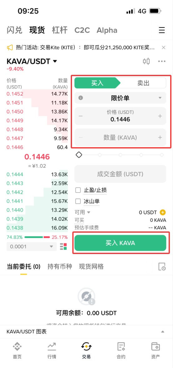 5、依次选择【限价单】-购买【价格】-购买【数量】-【成交数量】,设置好之后,点击【买入KAVA】。