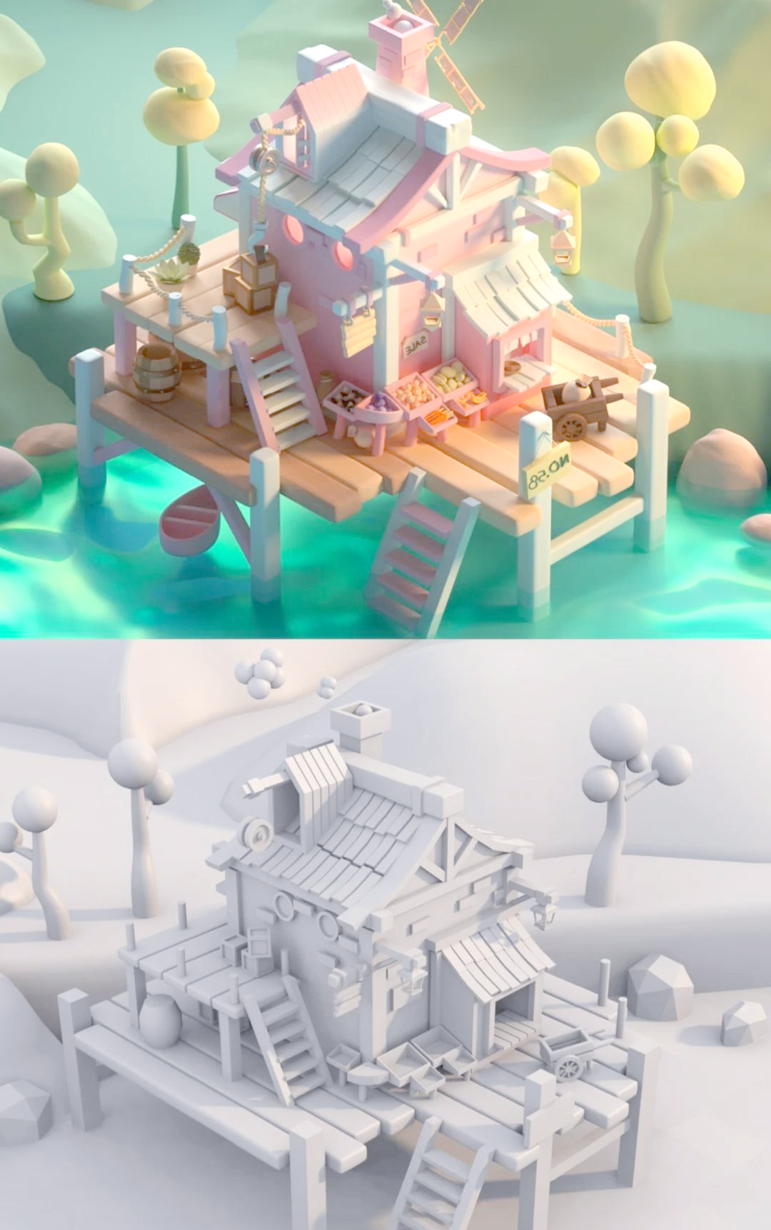 4. 多角度输出参考: 一个3D模型可以轻松输出无数个角度的渲染图或线框图,为绘制一系列场景连贯的原画(如不同视角的城堡、村庄街景)提供了一致且准确的参考,极大提高了系列作品的生产效率和质量稳定性。